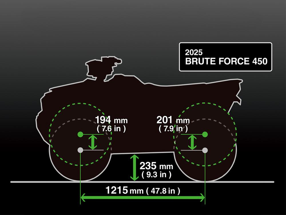 Not too large and not too small, the BRUTE FORCE 450’s compact body is the ideal size. It fits a wide range of riders, offers plenty of space to haul cargo, and is compact enough to get around the trail or worksite with ease.